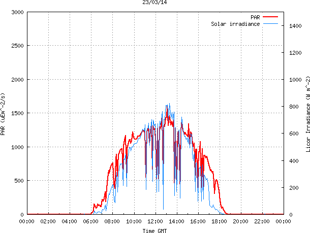The PML meteorological station, situated on the south-west corner of the building roof, consists of a Hygroclip S3 temperature and humidity sensor housed in a radiation shield, a Mierij Meteo solid state wind sensor (MMW-005), a Chelsea instruments half-hemisphere PAR sensor, a Li-Cor pyranometer (LI-200SZ) and an Omni Instruments 6" tipping bucket raingauge (RG200). The data are logged every 5 minutes using a Pace Scientific XR5 data logger. The real-time rainfall data is likely in error - the correct values will be displayed after a time lag of approximately 24 hours. The meteorological station is sheltered from winds in the north-east and underestimates winds from this quarter. To use these data please contact Dr Tim Smyth.
