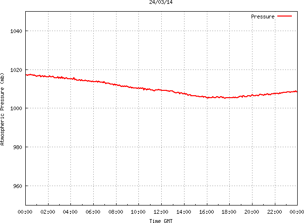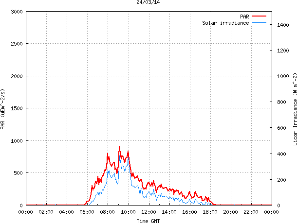 The PML meteorological station, situated on the south-west corner of the building roof, consists of a Hygroclip S3 temperature and humidity sensor housed in a radiation shield, a Mierij Meteo solid state wind sensor (MMW-005), a Chelsea instruments half-hemisphere PAR sensor, a Li-Cor pyranometer (LI-200SZ) and an Omni Instruments 6" tipping bucket raingauge (RG200). The data are logged every 5 minutes using a Pace Scientific XR5 data logger. The real-time rainfall data is likely in error - the correct values will be displayed after a time lag of approximately 24 hours. The meteorological station is sheltered from winds in the north-east and underestimates winds from this quarter. To use these data please contact Dr Tim Smyth.