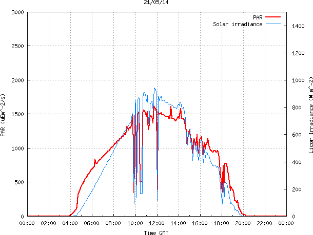 The PML meteorological station, situated on the south-west corner of the building roof, consists of a Hygroclip S3 temperature and humidity sensor housed in a radiation shield, a Mierij Meteo solid state wind sensor (MMW-005), a Chelsea instruments half-hemisphere PAR sensor, a Li-Cor pyranometer (LI-200SZ) and an Omni Instruments 6" tipping bucket raingauge (RG200). The data are logged every 5 minutes using a Pace Scientific XR5 data logger. The real-time rainfall data is likely in error - the correct values will be displayed after a time lag of approximately 24 hours. The meteorological station is sheltered from winds in the north-east and underestimates winds from this quarter. To use these data please contact Dr Tim Smyth.