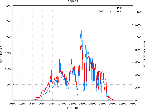 The PML meteorological station, situated on the south-west corner of the building roof, consists of a Hygroclip S3 temperature and humidity sensor housed in a radiation shield, a Mierij Meteo solid state wind sensor (MMW-005), a Chelsea instruments half-hemisphere PAR sensor, a Li-Cor pyranometer (LI-200SZ) and an Omni Instruments 6" tipping bucket raingauge (RG200). The data are logged every 5 minutes using a Pace Scientific XR5 data logger. The real-time rainfall data is likely in error - the correct values will be displayed after a time lag of approximately 24 hours. The meteorological station is sheltered from winds in the north-east and underestimates winds from this quarter. To use these data please contact Dr Tim Smyth.