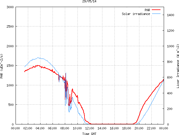 The PML meteorological station, situated on the south-west corner of the building roof, consists of a Hygroclip S3 temperature and humidity sensor housed in a radiation shield, a Mierij Meteo solid state wind sensor (MMW-005), a Chelsea instruments half-hemisphere PAR sensor, a Li-Cor pyranometer (LI-200SZ) and an Omni Instruments 6" tipping bucket raingauge (RG200). The data are logged every 5 minutes using a Pace Scientific XR5 data logger. The real-time rainfall data is likely in error - the correct values will be displayed after a time lag of approximately 24 hours. The meteorological station is sheltered from winds in the north-east and underestimates winds from this quarter. To use these data please contact Dr Tim Smyth.
