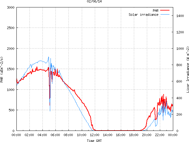 The PML meteorological station, situated on the south-west corner of the building roof, consists of a Hygroclip S3 temperature and humidity sensor housed in a radiation shield, a Mierij Meteo solid state wind sensor (MMW-005), a Chelsea instruments half-hemisphere PAR sensor, a Li-Cor pyranometer (LI-200SZ) and an Omni Instruments 6" tipping bucket raingauge (RG200). The data are logged every 5 minutes using a Pace Scientific XR5 data logger. The real-time rainfall data is likely in error - the correct values will be displayed after a time lag of approximately 24 hours. The meteorological station is sheltered from winds in the north-east and underestimates winds from this quarter. To use these data please contact Dr Tim Smyth.