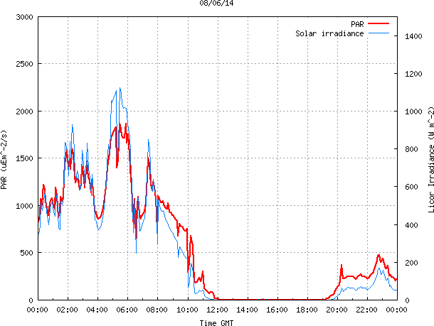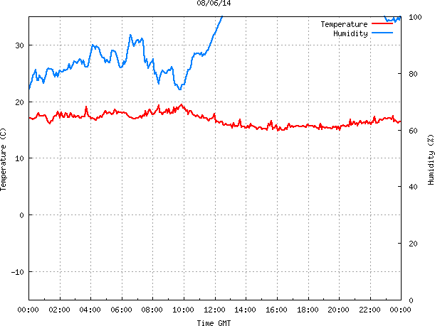 The PML meteorological station, situated on the south-west corner of the building roof, consists of a Hygroclip S3 temperature and humidity sensor housed in a radiation shield, a Mierij Meteo solid state wind sensor (MMW-005), a Chelsea instruments half-hemisphere PAR sensor, a Li-Cor pyranometer (LI-200SZ) and an Omni Instruments 6" tipping bucket raingauge (RG200). The data are logged every 5 minutes using a Pace Scientific XR5 data logger. The real-time rainfall data is likely in error - the correct values will be displayed after a time lag of approximately 24 hours. The meteorological station is sheltered from winds in the north-east and underestimates winds from this quarter. To use these data please contact Dr Tim Smyth.