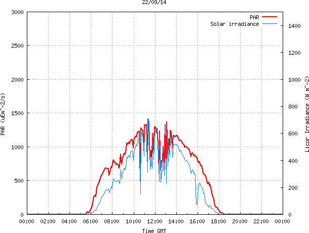 The PML meteorological station, situated on the south-west corner of the building roof, consists of a Hygroclip S3 temperature and humidity sensor housed in a radiation shield, a Mierij Meteo solid state wind sensor (MMW-005), a Chelsea instruments half-hemisphere PAR sensor, a Li-Cor pyranometer (LI-200SZ) and an Omni Instruments 6" tipping bucket raingauge (RG200). The data are logged every 5 minutes using a Pace Scientific XR5 data logger. The real-time rainfall data is likely in error - the correct values will be displayed after a time lag of approximately 24 hours. The meteorological station is sheltered from winds in the north-east and underestimates winds from this quarter. To use these data please contact Dr Tim Smyth.