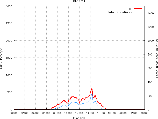 The PML meteorological station, situated on the south-west corner of the building roof, consists of a Hygroclip S3 temperature and humidity sensor housed in a radiation shield, a Mierij Meteo solid state wind sensor (MMW-005), a Chelsea instruments half-hemisphere PAR sensor, a Li-Cor pyranometer (LI-200SZ) and an Omni Instruments 6" tipping bucket raingauge (RG200). The data are logged every 5 minutes using a Pace Scientific XR5 data logger. The real-time rainfall data is likely in error - the correct values will be displayed after a time lag of approximately 24 hours. The meteorological station is sheltered from winds in the north-east and underestimates winds from this quarter. To use these data please contact Dr Tim Smyth.
