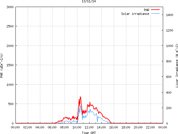 The PML meteorological station, situated on the south-west corner of the building roof, consists of a Hygroclip S3 temperature and humidity sensor housed in a radiation shield, a Mierij Meteo solid state wind sensor (MMW-005), a Chelsea instruments half-hemisphere PAR sensor, a Li-Cor pyranometer (LI-200SZ) and an Omni Instruments 6" tipping bucket raingauge (RG200). The data are logged every 5 minutes using a Pace Scientific XR5 data logger. The real-time rainfall data is likely in error - the correct values will be displayed after a time lag of approximately 24 hours. The meteorological station is sheltered from winds in the north-east and underestimates winds from this quarter. To use these data please contact Dr Tim Smyth.