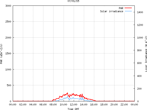 The PML meteorological station, situated on the south-west corner of the building roof, consists of a Hygroclip S3 temperature and humidity sensor housed in a radiation shield, a Mierij Meteo solid state wind sensor (MMW-005), a Chelsea instruments half-hemisphere PAR sensor, a Li-Cor pyranometer (LI-200SZ) and an Omni Instruments 6" tipping bucket raingauge (RG200). The data are logged every 5 minutes using a Pace Scientific XR5 data logger. The real-time rainfall data is likely in error - the correct values will be displayed after a time lag of approximately 24 hours. The meteorological station is sheltered from winds in the north-east and underestimates winds from this quarter. To use these data please contact Dr Tim Smyth.