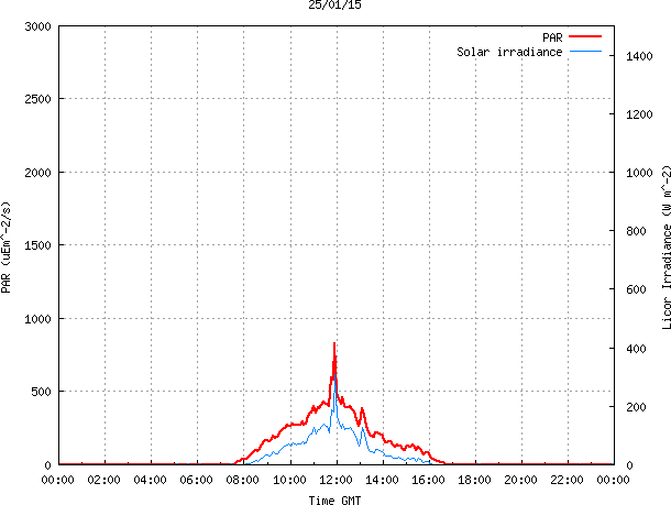 The PML meteorological station, situated on the south-west corner of the building roof, consists of a Hygroclip S3 temperature and humidity sensor housed in a radiation shield, a Mierij Meteo solid state wind sensor (MMW-005), a Chelsea instruments half-hemisphere PAR sensor, a Li-Cor pyranometer (LI-200SZ) and an Omni Instruments 6" tipping bucket raingauge (RG200). The data are logged every 5 minutes using a Pace Scientific XR5 data logger. The real-time rainfall data is likely in error - the correct values will be displayed after a time lag of approximately 24 hours. The meteorological station is sheltered from winds in the north-east and underestimates winds from this quarter. To use these data please contact Dr Tim Smyth.