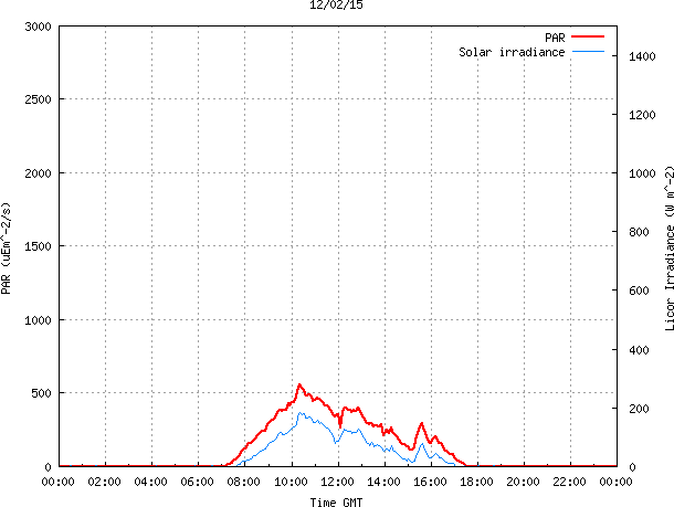 The PML meteorological station, situated on the south-west corner of the building roof, consists of a Hygroclip S3 temperature and humidity sensor housed in a radiation shield, a Mierij Meteo solid state wind sensor (MMW-005), a Chelsea instruments half-hemisphere PAR sensor, a Li-Cor pyranometer (LI-200SZ) and an Omni Instruments 6" tipping bucket raingauge (RG200). The data are logged every 5 minutes using a Pace Scientific XR5 data logger. The real-time rainfall data is likely in error - the correct values will be displayed after a time lag of approximately 24 hours. The meteorological station is sheltered from winds in the north-east and underestimates winds from this quarter. To use these data please contact Dr Tim Smyth.