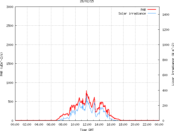 The PML meteorological station, situated on the south-west corner of the building roof, consists of a Hygroclip S3 temperature and humidity sensor housed in a radiation shield, a Mierij Meteo solid state wind sensor (MMW-005), a Chelsea instruments half-hemisphere PAR sensor, a Li-Cor pyranometer (LI-200SZ) and an Omni Instruments 6" tipping bucket raingauge (RG200). The data are logged every 5 minutes using a Pace Scientific XR5 data logger. The real-time rainfall data is likely in error - the correct values will be displayed after a time lag of approximately 24 hours. The meteorological station is sheltered from winds in the north-east and underestimates winds from this quarter. To use these data please contact Dr Tim Smyth.