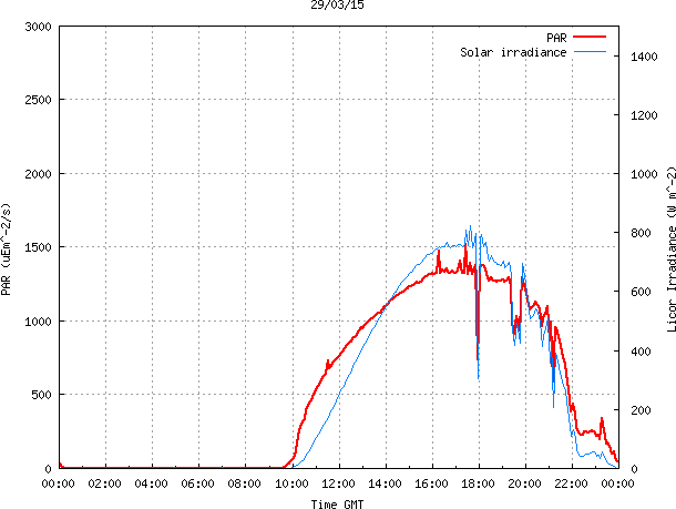 The PML meteorological station, situated on the south-west corner of the building roof, consists of a Hygroclip S3 temperature and humidity sensor housed in a radiation shield, a Mierij Meteo solid state wind sensor (MMW-005), a Chelsea instruments half-hemisphere PAR sensor, a Li-Cor pyranometer (LI-200SZ) and an Omni Instruments 6" tipping bucket raingauge (RG200). The data are logged every 5 minutes using a Pace Scientific XR5 data logger. The real-time rainfall data is likely in error - the correct values will be displayed after a time lag of approximately 24 hours. The meteorological station is sheltered from winds in the north-east and underestimates winds from this quarter. To use these data please contact Dr Tim Smyth.