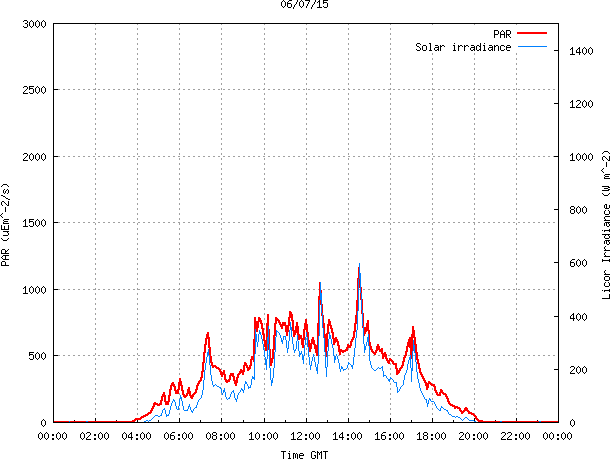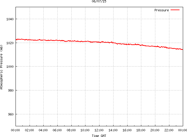 The PML meteorological station, situated on the south-west corner of the building roof, consists of a Hygroclip S3 temperature and humidity sensor housed in a radiation shield, a Mierij Meteo solid state wind sensor (MMW-005), a Chelsea instruments half-hemisphere PAR sensor, a Li-Cor pyranometer (LI-200SZ) and an Omni Instruments 6" tipping bucket raingauge (RG200). The data are logged every 5 minutes using a Pace Scientific XR5 data logger. The real-time rainfall data is likely in error - the correct values will be displayed after a time lag of approximately 24 hours. The meteorological station is sheltered from winds in the north-east and underestimates winds from this quarter. To use these data please contact Dr Tim Smyth.