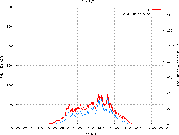 The PML meteorological station, situated on the south-west corner of the building roof, consists of a Hygroclip S3 temperature and humidity sensor housed in a radiation shield, a Mierij Meteo solid state wind sensor (MMW-005), a Chelsea instruments half-hemisphere PAR sensor, a Li-Cor pyranometer (LI-200SZ) and an Omni Instruments 6" tipping bucket raingauge (RG200). The data are logged every 5 minutes using a Pace Scientific XR5 data logger. The real-time rainfall data is likely in error - the correct values will be displayed after a time lag of approximately 24 hours. The meteorological station is sheltered from winds in the north-east and underestimates winds from this quarter. To use these data please contact Dr Tim Smyth.