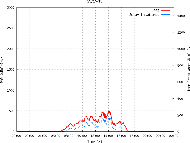 The PML meteorological station, situated on the south-west corner of the building roof, consists of a Hygroclip S3 temperature and humidity sensor housed in a radiation shield, a Mierij Meteo solid state wind sensor (MMW-005), a Chelsea instruments half-hemisphere PAR sensor, a Li-Cor pyranometer (LI-200SZ) and an Omni Instruments 6" tipping bucket raingauge (RG200). The data are logged every 5 minutes using a Pace Scientific XR5 data logger. The real-time rainfall data is likely in error - the correct values will be displayed after a time lag of approximately 24 hours. The meteorological station is sheltered from winds in the north-east and underestimates winds from this quarter. To use these data please contact Dr Tim Smyth.