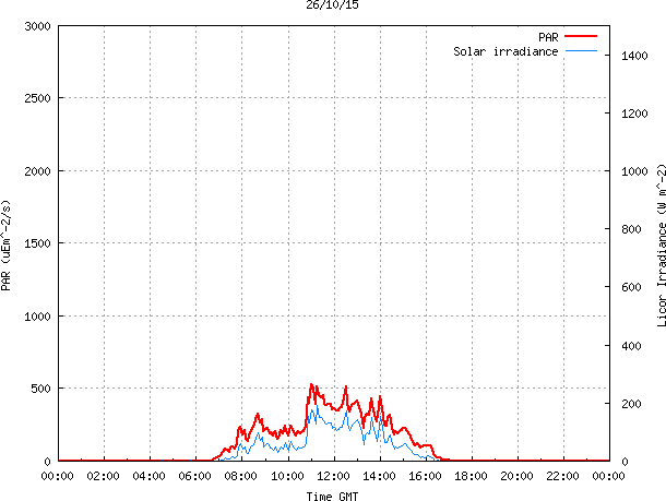 The PML meteorological station, situated on the south-west corner of the building roof, consists of a Hygroclip S3 temperature and humidity sensor housed in a radiation shield, a Mierij Meteo solid state wind sensor (MMW-005), a Chelsea instruments half-hemisphere PAR sensor, a Li-Cor pyranometer (LI-200SZ) and an Omni Instruments 6" tipping bucket raingauge (RG200). The data are logged every 5 minutes using a Pace Scientific XR5 data logger. The real-time rainfall data is likely in error - the correct values will be displayed after a time lag of approximately 24 hours. The meteorological station is sheltered from winds in the north-east and underestimates winds from this quarter. To use these data please contact Dr Tim Smyth.