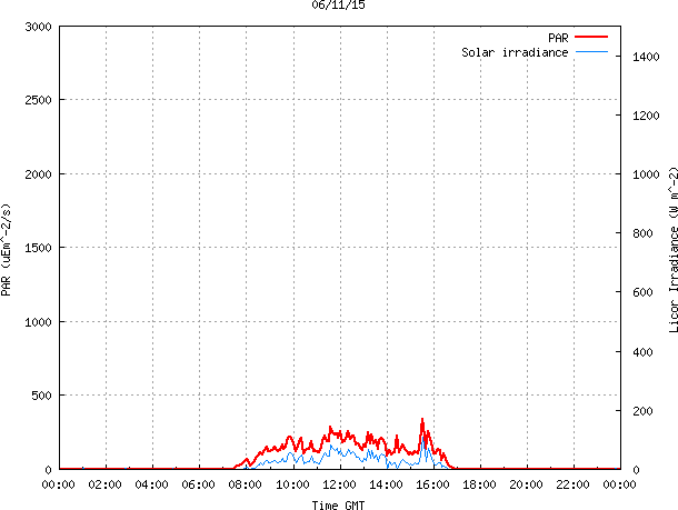 The PML meteorological station, situated on the south-west corner of the building roof, consists of a Hygroclip S3 temperature and humidity sensor housed in a radiation shield, a Mierij Meteo solid state wind sensor (MMW-005), a Chelsea instruments half-hemisphere PAR sensor, a Li-Cor pyranometer (LI-200SZ) and an Omni Instruments 6" tipping bucket raingauge (RG200). The data are logged every 5 minutes using a Pace Scientific XR5 data logger. The real-time rainfall data is likely in error - the correct values will be displayed after a time lag of approximately 24 hours. The meteorological station is sheltered from winds in the north-east and underestimates winds from this quarter. To use these data please contact Dr Tim Smyth.
