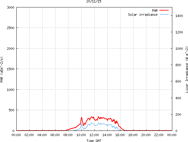 The PML meteorological station, situated on the south-west corner of the building roof, consists of a Hygroclip S3 temperature and humidity sensor housed in a radiation shield, a Mierij Meteo solid state wind sensor (MMW-005), a Chelsea instruments half-hemisphere PAR sensor, a Li-Cor pyranometer (LI-200SZ) and an Omni Instruments 6" tipping bucket raingauge (RG200). The data are logged every 5 minutes using a Pace Scientific XR5 data logger. The real-time rainfall data is likely in error - the correct values will be displayed after a time lag of approximately 24 hours. The meteorological station is sheltered from winds in the north-east and underestimates winds from this quarter. To use these data please contact Dr Tim Smyth.