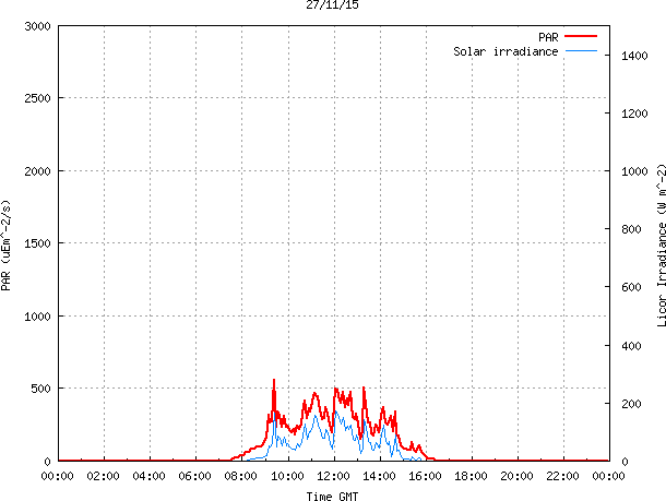 The PML meteorological station, situated on the south-west corner of the building roof, consists of a Hygroclip S3 temperature and humidity sensor housed in a radiation shield, a Mierij Meteo solid state wind sensor (MMW-005), a Chelsea instruments half-hemisphere PAR sensor, a Li-Cor pyranometer (LI-200SZ) and an Omni Instruments 6" tipping bucket raingauge (RG200). The data are logged every 5 minutes using a Pace Scientific XR5 data logger. The real-time rainfall data is likely in error - the correct values will be displayed after a time lag of approximately 24 hours. The meteorological station is sheltered from winds in the north-east and underestimates winds from this quarter. To use these data please contact Dr Tim Smyth.