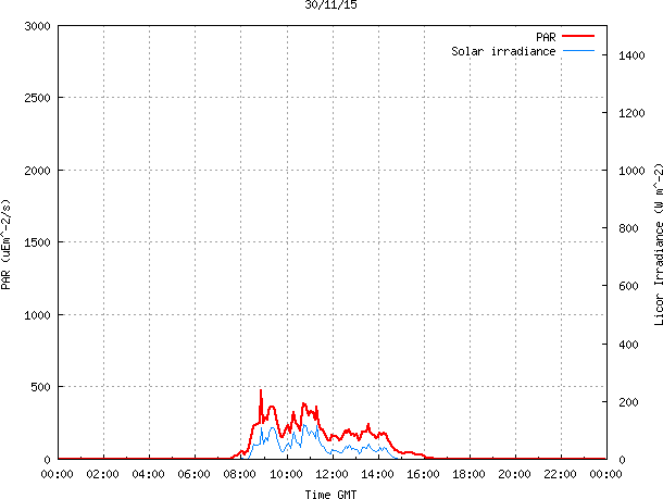 The PML meteorological station, situated on the south-west corner of the building roof, consists of a Hygroclip S3 temperature and humidity sensor housed in a radiation shield, a Mierij Meteo solid state wind sensor (MMW-005), a Chelsea instruments half-hemisphere PAR sensor, a Li-Cor pyranometer (LI-200SZ) and an Omni Instruments 6" tipping bucket raingauge (RG200). The data are logged every 5 minutes using a Pace Scientific XR5 data logger. The real-time rainfall data is likely in error - the correct values will be displayed after a time lag of approximately 24 hours. The meteorological station is sheltered from winds in the north-east and underestimates winds from this quarter. To use these data please contact Dr Tim Smyth.