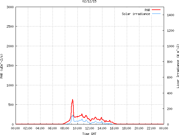 The PML meteorological station, situated on the south-west corner of the building roof, consists of a Hygroclip S3 temperature and humidity sensor housed in a radiation shield, a Mierij Meteo solid state wind sensor (MMW-005), a Chelsea instruments half-hemisphere PAR sensor, a Li-Cor pyranometer (LI-200SZ) and an Omni Instruments 6" tipping bucket raingauge (RG200). The data are logged every 5 minutes using a Pace Scientific XR5 data logger. The real-time rainfall data is likely in error - the correct values will be displayed after a time lag of approximately 24 hours. The meteorological station is sheltered from winds in the north-east and underestimates winds from this quarter. To use these data please contact Dr Tim Smyth.