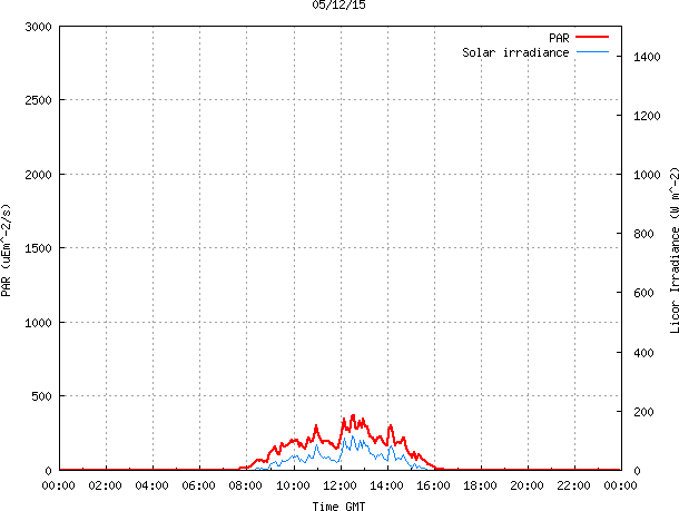 The PML meteorological station, situated on the south-west corner of the building roof, consists of a Hygroclip S3 temperature and humidity sensor housed in a radiation shield, a Mierij Meteo solid state wind sensor (MMW-005), a Chelsea instruments half-hemisphere PAR sensor, a Li-Cor pyranometer (LI-200SZ) and an Omni Instruments 6" tipping bucket raingauge (RG200). The data are logged every 5 minutes using a Pace Scientific XR5 data logger. The real-time rainfall data is likely in error - the correct values will be displayed after a time lag of approximately 24 hours. The meteorological station is sheltered from winds in the north-east and underestimates winds from this quarter. To use these data please contact Dr Tim Smyth.