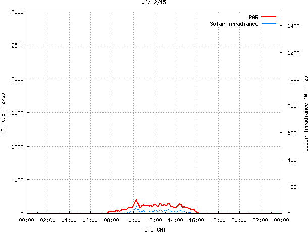 The PML meteorological station, situated on the south-west corner of the building roof, consists of a Hygroclip S3 temperature and humidity sensor housed in a radiation shield, a Mierij Meteo solid state wind sensor (MMW-005), a Chelsea instruments half-hemisphere PAR sensor, a Li-Cor pyranometer (LI-200SZ) and an Omni Instruments 6" tipping bucket raingauge (RG200). The data are logged every 5 minutes using a Pace Scientific XR5 data logger. The real-time rainfall data is likely in error - the correct values will be displayed after a time lag of approximately 24 hours. The meteorological station is sheltered from winds in the north-east and underestimates winds from this quarter. To use these data please contact Dr Tim Smyth.