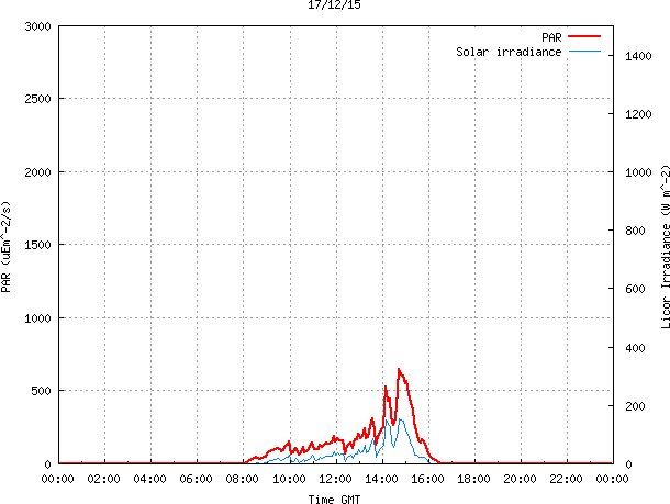 The PML meteorological station, situated on the south-west corner of the building roof, consists of a Hygroclip S3 temperature and humidity sensor housed in a radiation shield, a Mierij Meteo solid state wind sensor (MMW-005), a Chelsea instruments half-hemisphere PAR sensor, a Li-Cor pyranometer (LI-200SZ) and an Omni Instruments 6" tipping bucket raingauge (RG200). The data are logged every 5 minutes using a Pace Scientific XR5 data logger. The real-time rainfall data is likely in error - the correct values will be displayed after a time lag of approximately 24 hours. The meteorological station is sheltered from winds in the north-east and underestimates winds from this quarter. To use these data please contact Dr Tim Smyth.