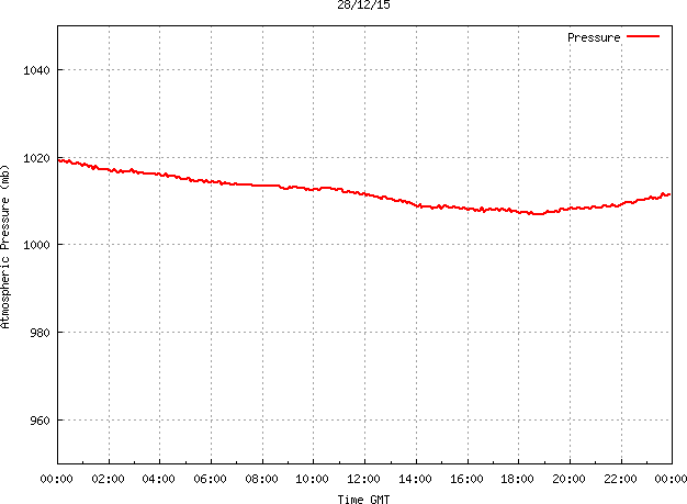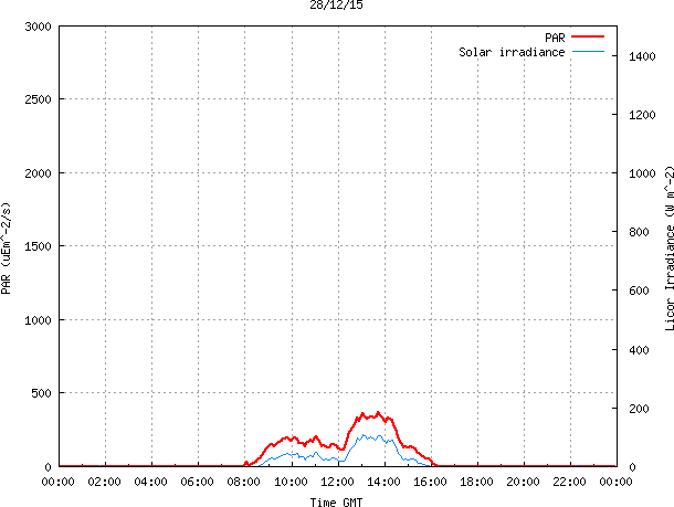 The PML meteorological station, situated on the south-west corner of the building roof, consists of a Hygroclip S3 temperature and humidity sensor housed in a radiation shield, a Mierij Meteo solid state wind sensor (MMW-005), a Chelsea instruments half-hemisphere PAR sensor, a Li-Cor pyranometer (LI-200SZ) and an Omni Instruments 6" tipping bucket raingauge (RG200). The data are logged every 5 minutes using a Pace Scientific XR5 data logger. The real-time rainfall data is likely in error - the correct values will be displayed after a time lag of approximately 24 hours. The meteorological station is sheltered from winds in the north-east and underestimates winds from this quarter. To use these data please contact Dr Tim Smyth.