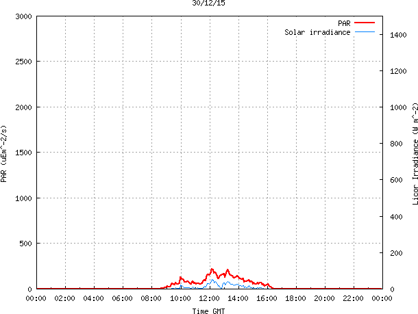 The PML meteorological station, situated on the south-west corner of the building roof, consists of a Hygroclip S3 temperature and humidity sensor housed in a radiation shield, a Mierij Meteo solid state wind sensor (MMW-005), a Chelsea instruments half-hemisphere PAR sensor, a Li-Cor pyranometer (LI-200SZ) and an Omni Instruments 6" tipping bucket raingauge (RG200). The data are logged every 5 minutes using a Pace Scientific XR5 data logger. The real-time rainfall data is likely in error - the correct values will be displayed after a time lag of approximately 24 hours. The meteorological station is sheltered from winds in the north-east and underestimates winds from this quarter. To use these data please contact Dr Tim Smyth.