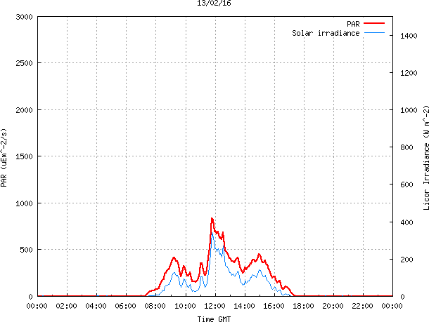 The PML meteorological station, situated on the south-west corner of the building roof, consists of a Hygroclip S3 temperature and humidity sensor housed in a radiation shield, a Mierij Meteo solid state wind sensor (MMW-005), a Chelsea instruments half-hemisphere PAR sensor, a Li-Cor pyranometer (LI-200SZ) and an Omni Instruments 6" tipping bucket raingauge (RG200). The data are logged every 5 minutes using a Pace Scientific XR5 data logger. The real-time rainfall data is likely in error - the correct values will be displayed after a time lag of approximately 24 hours. The meteorological station is sheltered from winds in the north-east and underestimates winds from this quarter. To use these data please contact Dr Tim Smyth.