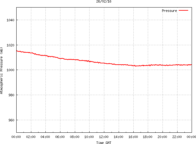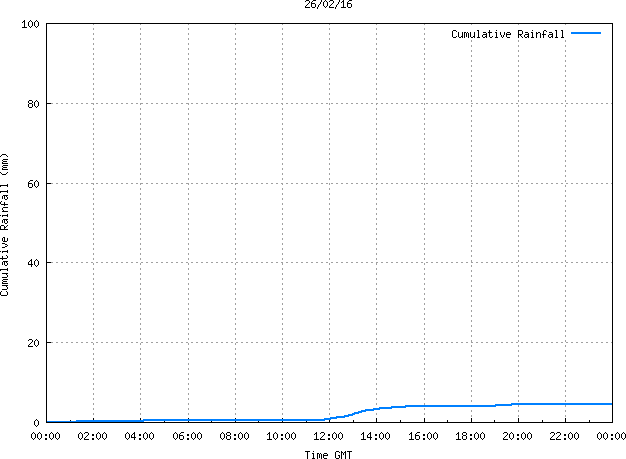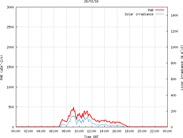 The PML meteorological station, situated on the south-west corner of the building roof, consists of a Hygroclip S3 temperature and humidity sensor housed in a radiation shield, a Mierij Meteo solid state wind sensor (MMW-005), a Chelsea instruments half-hemisphere PAR sensor, a Li-Cor pyranometer (LI-200SZ) and an Omni Instruments 6" tipping bucket raingauge (RG200). The data are logged every 5 minutes using a Pace Scientific XR5 data logger. The real-time rainfall data is likely in error - the correct values will be displayed after a time lag of approximately 24 hours. The meteorological station is sheltered from winds in the north-east and underestimates winds from this quarter. To use these data please contact Dr Tim Smyth.