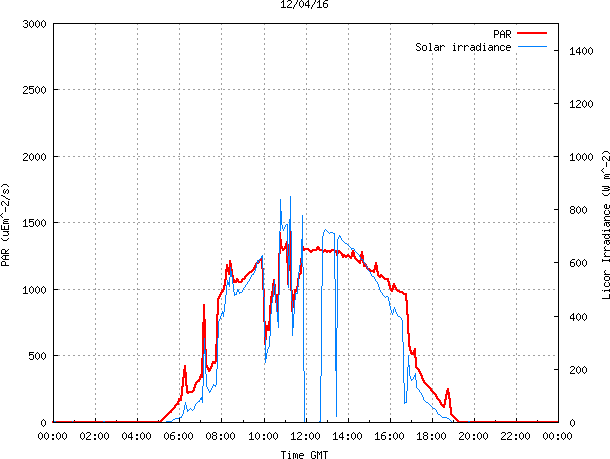 The PML meteorological station, situated on the south-west corner of the building roof, consists of a Hygroclip S3 temperature and humidity sensor housed in a radiation shield, a Mierij Meteo solid state wind sensor (MMW-005), a Chelsea instruments half-hemisphere PAR sensor, a Li-Cor pyranometer (LI-200SZ) and an Omni Instruments 6" tipping bucket raingauge (RG200). The data are logged every 5 minutes using a Pace Scientific XR5 data logger. The real-time rainfall data is likely in error - the correct values will be displayed after a time lag of approximately 24 hours. The meteorological station is sheltered from winds in the north-east and underestimates winds from this quarter. To use these data please contact Dr Tim Smyth.