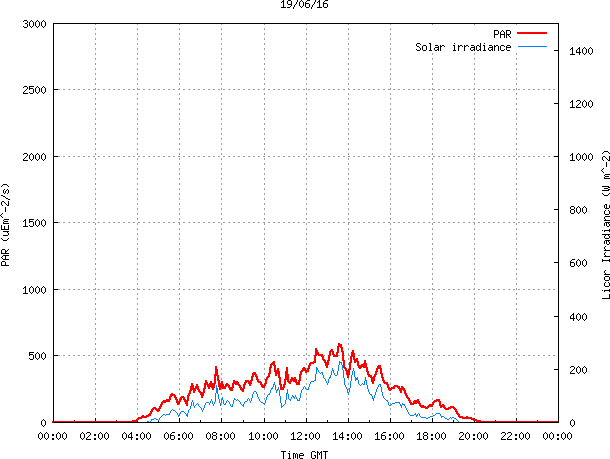 The PML meteorological station, situated on the south-west corner of the building roof, consists of a Hygroclip S3 temperature and humidity sensor housed in a radiation shield, a Mierij Meteo solid state wind sensor (MMW-005), a Chelsea instruments half-hemisphere PAR sensor, a Li-Cor pyranometer (LI-200SZ) and an Omni Instruments 6" tipping bucket raingauge (RG200). The data are logged every 5 minutes using a Pace Scientific XR5 data logger. The real-time rainfall data is likely in error - the correct values will be displayed after a time lag of approximately 24 hours. The meteorological station is sheltered from winds in the north-east and underestimates winds from this quarter. To use these data please contact Dr Tim Smyth.