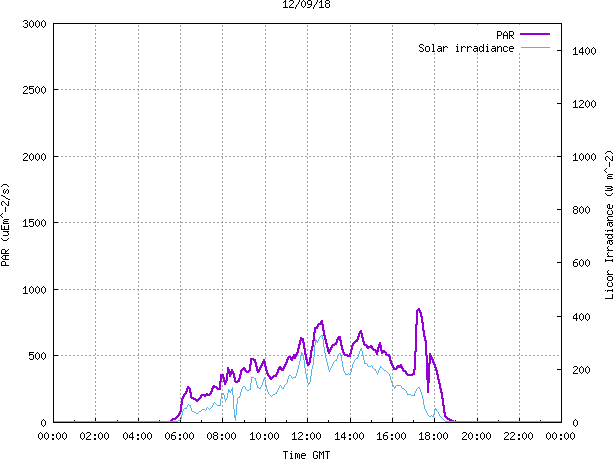 The PML meteorological station, situated on the south-west corner of the building roof, consists of a Hygroclip S3 temperature and humidity sensor housed in a radiation shield, a Mierij Meteo solid state wind sensor (MMW-005), a Chelsea instruments half-hemisphere PAR sensor, a Li-Cor pyranometer (LI-200SZ) and an Omni Instruments 6" tipping bucket raingauge (RG200). The data are logged every 5 minutes using a Pace Scientific XR5 data logger. The real-time rainfall data is likely in error - the correct values will be displayed after a time lag of approximately 24 hours. The meteorological station is sheltered from winds in the north-east and underestimates winds from this quarter. To use these data please contact Dr Tim Smyth.