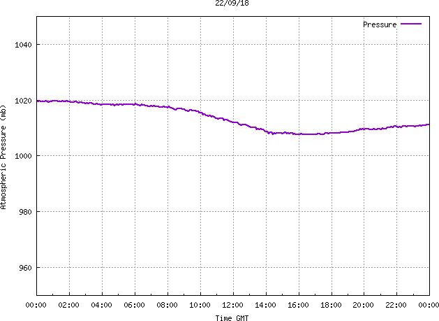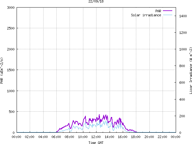 The PML meteorological station, situated on the south-west corner of the building roof, consists of a Hygroclip S3 temperature and humidity sensor housed in a radiation shield, a Mierij Meteo solid state wind sensor (MMW-005), a Chelsea instruments half-hemisphere PAR sensor, a Li-Cor pyranometer (LI-200SZ) and an Omni Instruments 6" tipping bucket raingauge (RG200). The data are logged every 5 minutes using a Pace Scientific XR5 data logger. The real-time rainfall data is likely in error - the correct values will be displayed after a time lag of approximately 24 hours. The meteorological station is sheltered from winds in the north-east and underestimates winds from this quarter. To use these data please contact Dr Tim Smyth.