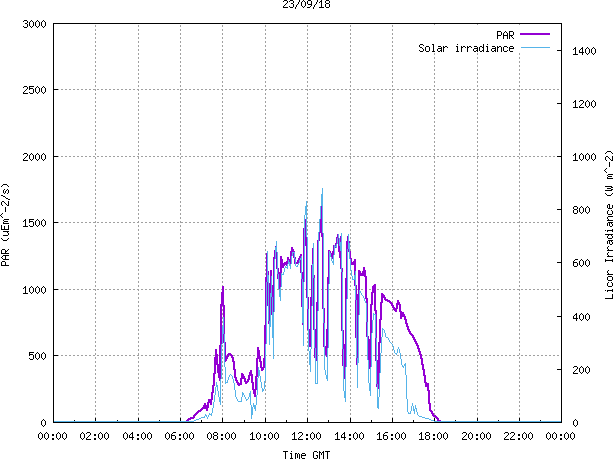 The PML meteorological station, situated on the south-west corner of the building roof, consists of a Hygroclip S3 temperature and humidity sensor housed in a radiation shield, a Mierij Meteo solid state wind sensor (MMW-005), a Chelsea instruments half-hemisphere PAR sensor, a Li-Cor pyranometer (LI-200SZ) and an Omni Instruments 6" tipping bucket raingauge (RG200). The data are logged every 5 minutes using a Pace Scientific XR5 data logger. The real-time rainfall data is likely in error - the correct values will be displayed after a time lag of approximately 24 hours. The meteorological station is sheltered from winds in the north-east and underestimates winds from this quarter. To use these data please contact Dr Tim Smyth.