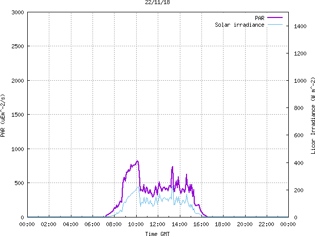 The PML meteorological station, situated on the south-west corner of the building roof, consists of a Hygroclip S3 temperature and humidity sensor housed in a radiation shield, a Mierij Meteo solid state wind sensor (MMW-005), a Chelsea instruments half-hemisphere PAR sensor, a Li-Cor pyranometer (LI-200SZ) and an Omni Instruments 6" tipping bucket raingauge (RG200). The data are logged every 5 minutes using a Pace Scientific XR5 data logger. The real-time rainfall data is likely in error - the correct values will be displayed after a time lag of approximately 24 hours. The meteorological station is sheltered from winds in the north-east and underestimates winds from this quarter. To use these data please contact Dr Tim Smyth.