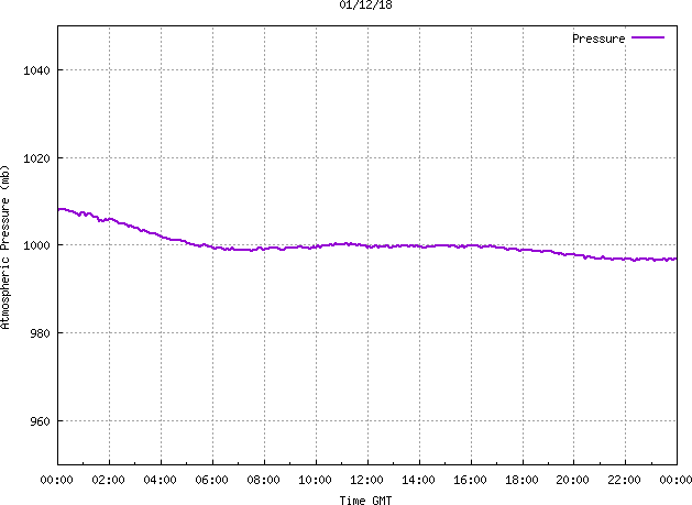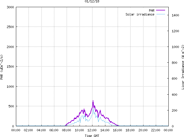 The PML meteorological station, situated on the south-west corner of the building roof, consists of a Hygroclip S3 temperature and humidity sensor housed in a radiation shield, a Mierij Meteo solid state wind sensor (MMW-005), a Chelsea instruments half-hemisphere PAR sensor, a Li-Cor pyranometer (LI-200SZ) and an Omni Instruments 6" tipping bucket raingauge (RG200). The data are logged every 5 minutes using a Pace Scientific XR5 data logger. The real-time rainfall data is likely in error - the correct values will be displayed after a time lag of approximately 24 hours. The meteorological station is sheltered from winds in the north-east and underestimates winds from this quarter. To use these data please contact Dr Tim Smyth.