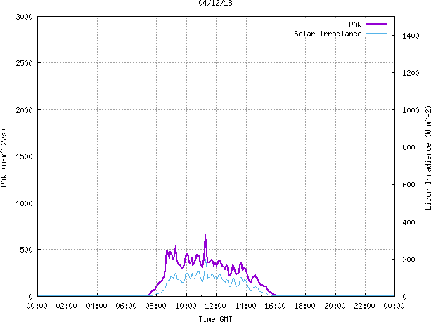 The PML meteorological station, situated on the south-west corner of the building roof, consists of a Hygroclip S3 temperature and humidity sensor housed in a radiation shield, a Mierij Meteo solid state wind sensor (MMW-005), a Chelsea instruments half-hemisphere PAR sensor, a Li-Cor pyranometer (LI-200SZ) and an Omni Instruments 6" tipping bucket raingauge (RG200). The data are logged every 5 minutes using a Pace Scientific XR5 data logger. The real-time rainfall data is likely in error - the correct values will be displayed after a time lag of approximately 24 hours. The meteorological station is sheltered from winds in the north-east and underestimates winds from this quarter. To use these data please contact Dr Tim Smyth.
