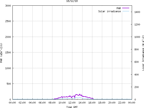 The PML meteorological station, situated on the south-west corner of the building roof, consists of a Hygroclip S3 temperature and humidity sensor housed in a radiation shield, a Mierij Meteo solid state wind sensor (MMW-005), a Chelsea instruments half-hemisphere PAR sensor, a Li-Cor pyranometer (LI-200SZ) and an Omni Instruments 6" tipping bucket raingauge (RG200). The data are logged every 5 minutes using a Pace Scientific XR5 data logger. The real-time rainfall data is likely in error - the correct values will be displayed after a time lag of approximately 24 hours. The meteorological station is sheltered from winds in the north-east and underestimates winds from this quarter. To use these data please contact Dr Tim Smyth.