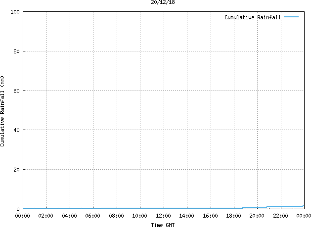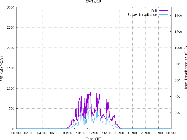 The PML meteorological station, situated on the south-west corner of the building roof, consists of a Hygroclip S3 temperature and humidity sensor housed in a radiation shield, a Mierij Meteo solid state wind sensor (MMW-005), a Chelsea instruments half-hemisphere PAR sensor, a Li-Cor pyranometer (LI-200SZ) and an Omni Instruments 6" tipping bucket raingauge (RG200). The data are logged every 5 minutes using a Pace Scientific XR5 data logger. The real-time rainfall data is likely in error - the correct values will be displayed after a time lag of approximately 24 hours. The meteorological station is sheltered from winds in the north-east and underestimates winds from this quarter. To use these data please contact Dr Tim Smyth.