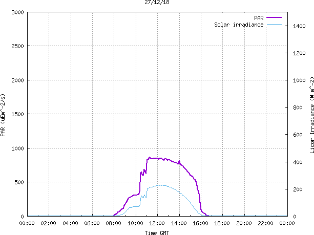 The PML meteorological station, situated on the south-west corner of the building roof, consists of a Hygroclip S3 temperature and humidity sensor housed in a radiation shield, a Mierij Meteo solid state wind sensor (MMW-005), a Chelsea instruments half-hemisphere PAR sensor, a Li-Cor pyranometer (LI-200SZ) and an Omni Instruments 6" tipping bucket raingauge (RG200). The data are logged every 5 minutes using a Pace Scientific XR5 data logger. The real-time rainfall data is likely in error - the correct values will be displayed after a time lag of approximately 24 hours. The meteorological station is sheltered from winds in the north-east and underestimates winds from this quarter. To use these data please contact Dr Tim Smyth.