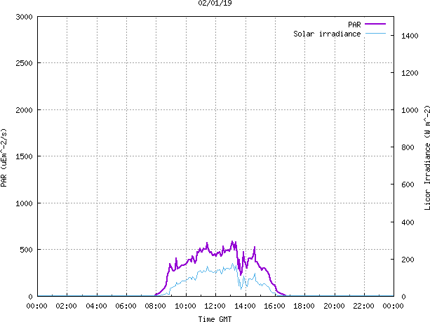 The PML meteorological station, situated on the south-west corner of the building roof, consists of a Hygroclip S3 temperature and humidity sensor housed in a radiation shield, a Mierij Meteo solid state wind sensor (MMW-005), a Chelsea instruments half-hemisphere PAR sensor, a Li-Cor pyranometer (LI-200SZ) and an Omni Instruments 6" tipping bucket raingauge (RG200). The data are logged every 5 minutes using a Pace Scientific XR5 data logger. The real-time rainfall data is likely in error - the correct values will be displayed after a time lag of approximately 24 hours. The meteorological station is sheltered from winds in the north-east and underestimates winds from this quarter. To use these data please contact Dr Tim Smyth.