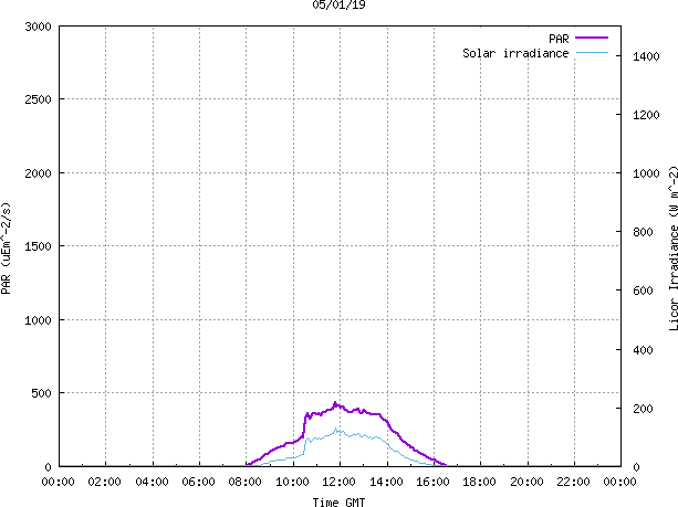 The PML meteorological station, situated on the south-west corner of the building roof, consists of a Hygroclip S3 temperature and humidity sensor housed in a radiation shield, a Mierij Meteo solid state wind sensor (MMW-005), a Chelsea instruments half-hemisphere PAR sensor, a Li-Cor pyranometer (LI-200SZ) and an Omni Instruments 6" tipping bucket raingauge (RG200). The data are logged every 5 minutes using a Pace Scientific XR5 data logger. The real-time rainfall data is likely in error - the correct values will be displayed after a time lag of approximately 24 hours. The meteorological station is sheltered from winds in the north-east and underestimates winds from this quarter. To use these data please contact Dr Tim Smyth.