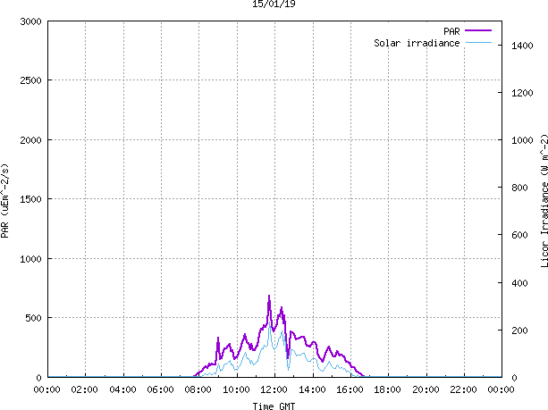 The PML meteorological station, situated on the south-west corner of the building roof, consists of a Hygroclip S3 temperature and humidity sensor housed in a radiation shield, a Mierij Meteo solid state wind sensor (MMW-005), a Chelsea instruments half-hemisphere PAR sensor, a Li-Cor pyranometer (LI-200SZ) and an Omni Instruments 6" tipping bucket raingauge (RG200). The data are logged every 5 minutes using a Pace Scientific XR5 data logger. The real-time rainfall data is likely in error - the correct values will be displayed after a time lag of approximately 24 hours. The meteorological station is sheltered from winds in the north-east and underestimates winds from this quarter. To use these data please contact Dr Tim Smyth.