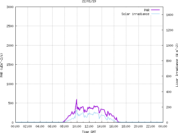 The PML meteorological station, situated on the south-west corner of the building roof, consists of a Hygroclip S3 temperature and humidity sensor housed in a radiation shield, a Mierij Meteo solid state wind sensor (MMW-005), a Chelsea instruments half-hemisphere PAR sensor, a Li-Cor pyranometer (LI-200SZ) and an Omni Instruments 6" tipping bucket raingauge (RG200). The data are logged every 5 minutes using a Pace Scientific XR5 data logger. The real-time rainfall data is likely in error - the correct values will be displayed after a time lag of approximately 24 hours. The meteorological station is sheltered from winds in the north-east and underestimates winds from this quarter. To use these data please contact Dr Tim Smyth.