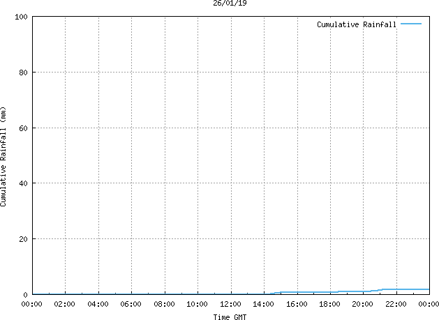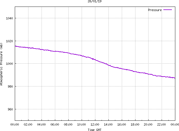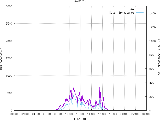 The PML meteorological station, situated on the south-west corner of the building roof, consists of a Hygroclip S3 temperature and humidity sensor housed in a radiation shield, a Mierij Meteo solid state wind sensor (MMW-005), a Chelsea instruments half-hemisphere PAR sensor, a Li-Cor pyranometer (LI-200SZ) and an Omni Instruments 6" tipping bucket raingauge (RG200). The data are logged every 5 minutes using a Pace Scientific XR5 data logger. The real-time rainfall data is likely in error - the correct values will be displayed after a time lag of approximately 24 hours. The meteorological station is sheltered from winds in the north-east and underestimates winds from this quarter. To use these data please contact Dr Tim Smyth.