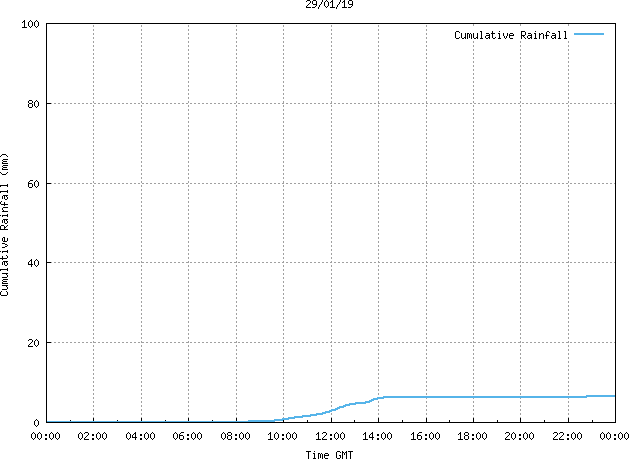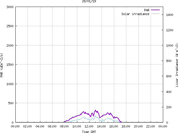 The PML meteorological station, situated on the south-west corner of the building roof, consists of a Hygroclip S3 temperature and humidity sensor housed in a radiation shield, a Mierij Meteo solid state wind sensor (MMW-005), a Chelsea instruments half-hemisphere PAR sensor, a Li-Cor pyranometer (LI-200SZ) and an Omni Instruments 6" tipping bucket raingauge (RG200). The data are logged every 5 minutes using a Pace Scientific XR5 data logger. The real-time rainfall data is likely in error - the correct values will be displayed after a time lag of approximately 24 hours. The meteorological station is sheltered from winds in the north-east and underestimates winds from this quarter. To use these data please contact Dr Tim Smyth.