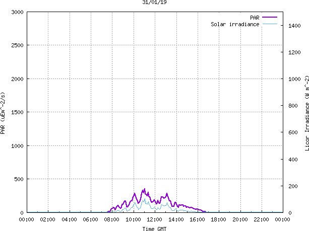 The PML meteorological station, situated on the south-west corner of the building roof, consists of a Hygroclip S3 temperature and humidity sensor housed in a radiation shield, a Mierij Meteo solid state wind sensor (MMW-005), a Chelsea instruments half-hemisphere PAR sensor, a Li-Cor pyranometer (LI-200SZ) and an Omni Instruments 6" tipping bucket raingauge (RG200). The data are logged every 5 minutes using a Pace Scientific XR5 data logger. The real-time rainfall data is likely in error - the correct values will be displayed after a time lag of approximately 24 hours. The meteorological station is sheltered from winds in the north-east and underestimates winds from this quarter. To use these data please contact Dr Tim Smyth.