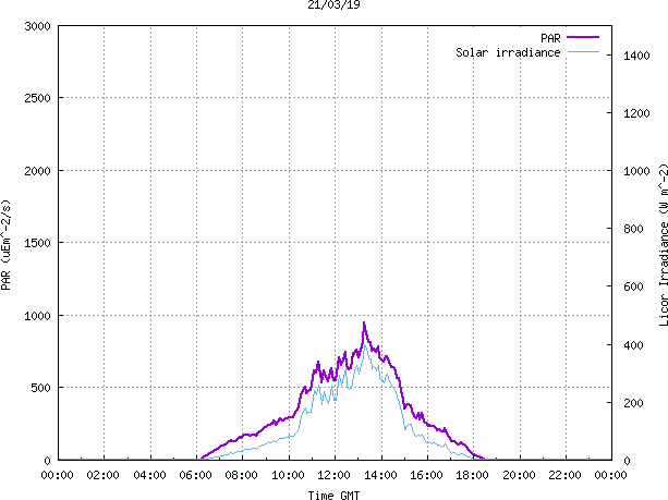 The PML meteorological station, situated on the south-west corner of the building roof, consists of a Hygroclip S3 temperature and humidity sensor housed in a radiation shield, a Mierij Meteo solid state wind sensor (MMW-005), a Chelsea instruments half-hemisphere PAR sensor, a Li-Cor pyranometer (LI-200SZ) and an Omni Instruments 6" tipping bucket raingauge (RG200). The data are logged every 5 minutes using a Pace Scientific XR5 data logger. The real-time rainfall data is likely in error - the correct values will be displayed after a time lag of approximately 24 hours. The meteorological station is sheltered from winds in the north-east and underestimates winds from this quarter. To use these data please contact Dr Tim Smyth.